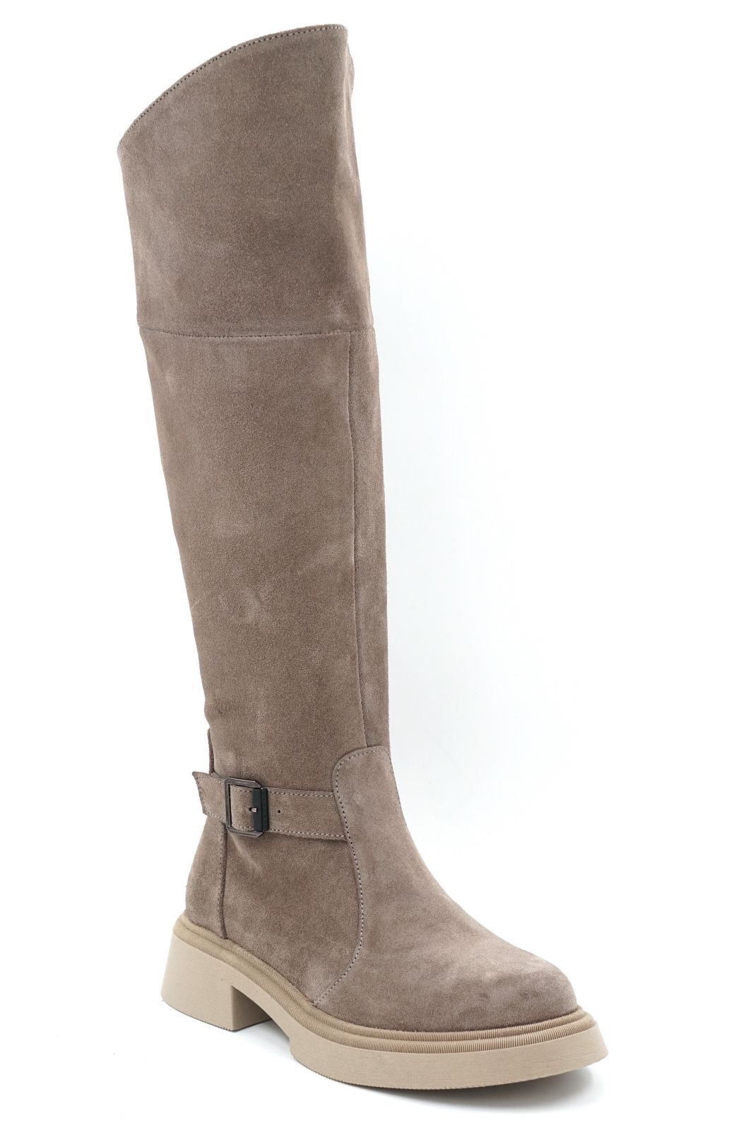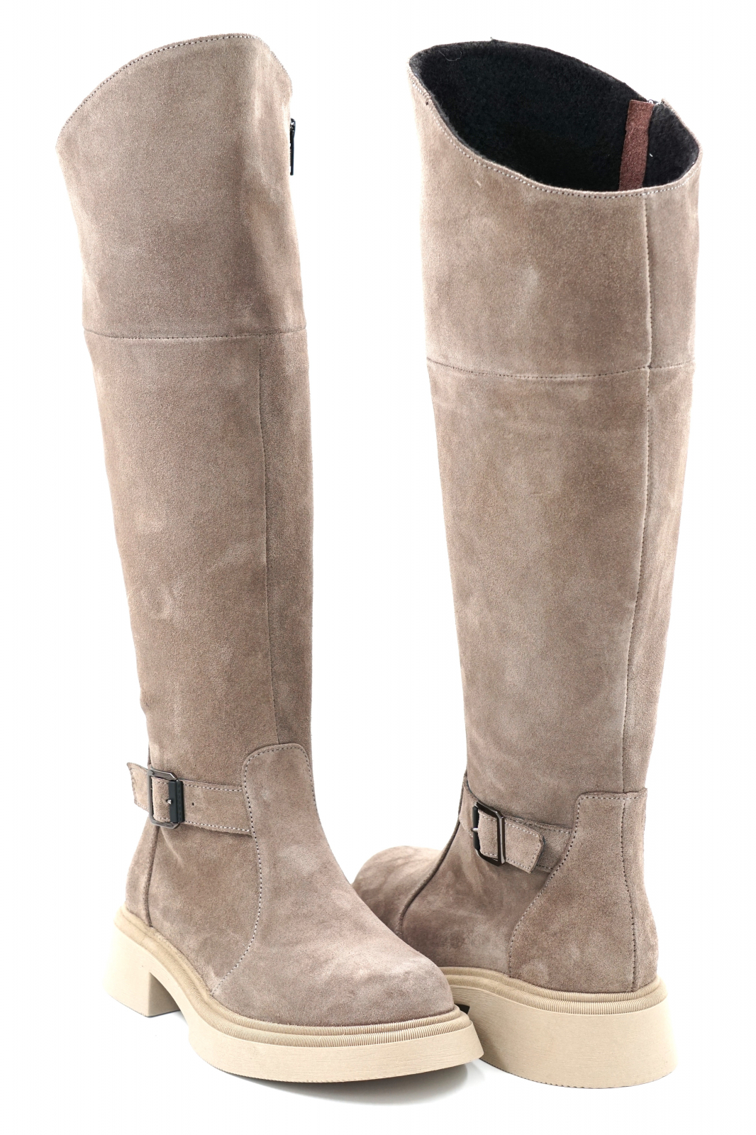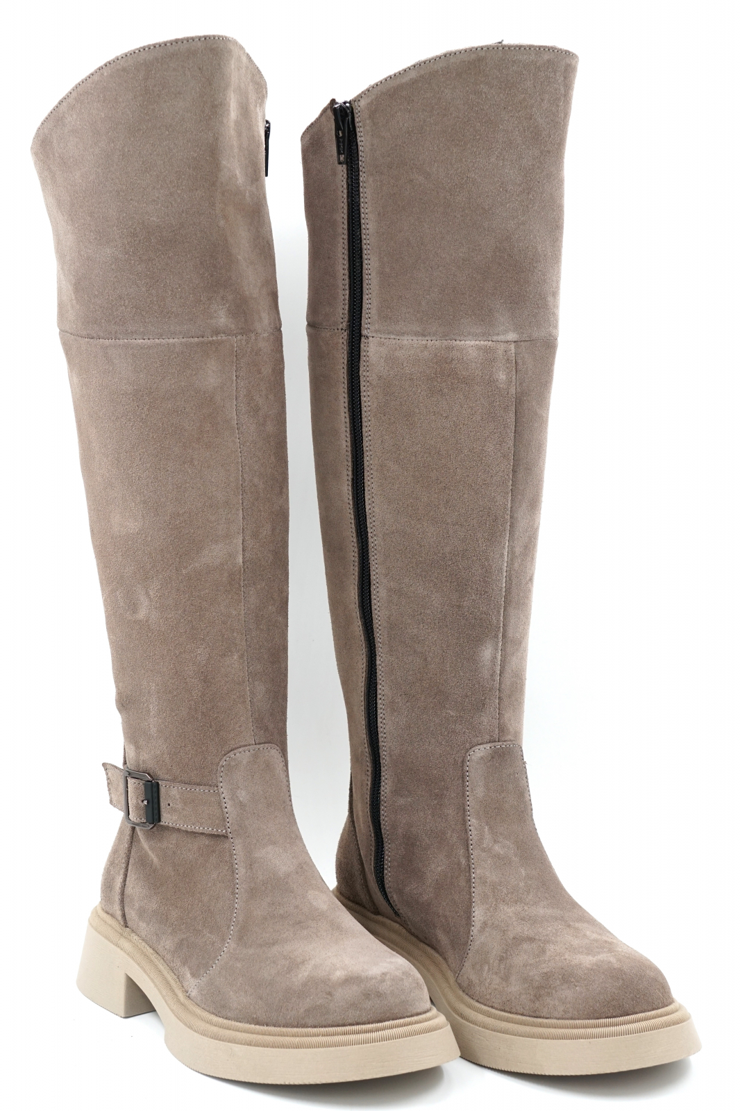 Cizme dama lungi casual din piele naturala intoarsa bej inchis grej cu varf rotund, talpa 3 cm si accesoriu metalic 73620-23