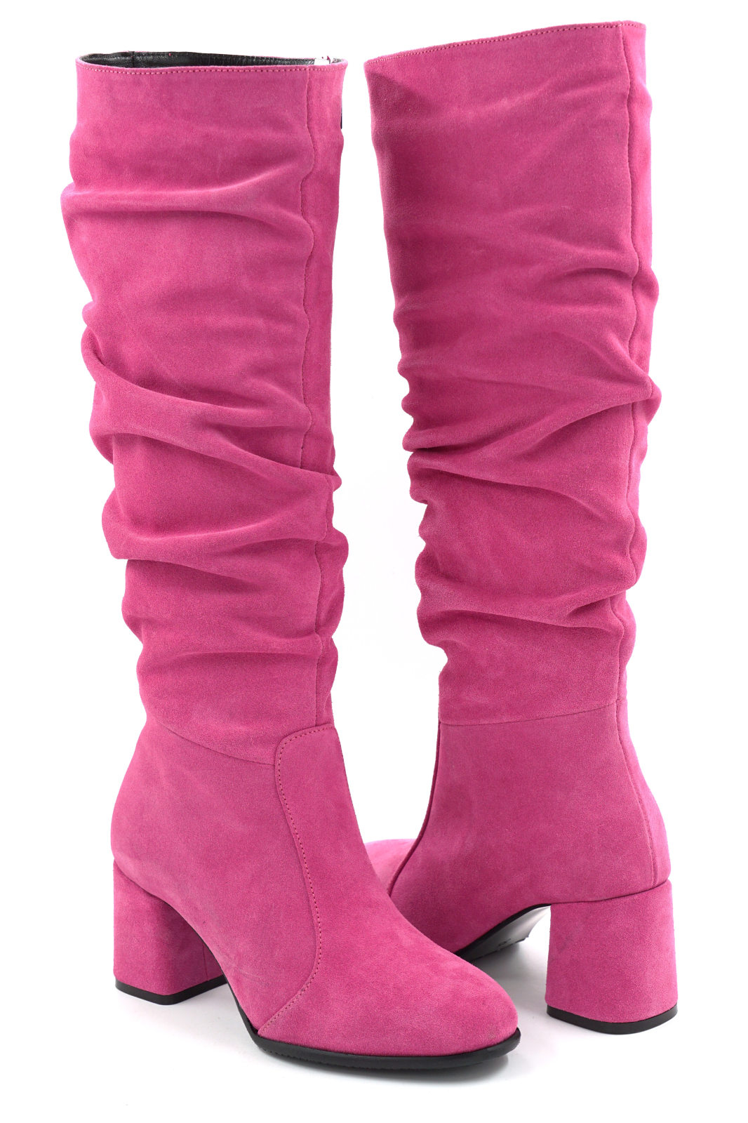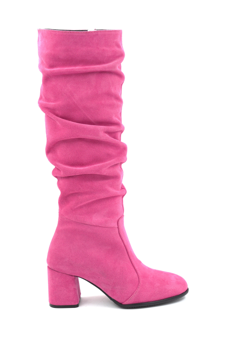 Cizme dama din piele naturala intoarsa roz fucsia cu varf rotund si toc mic gros imbracat de 6 cm 78321-10-25