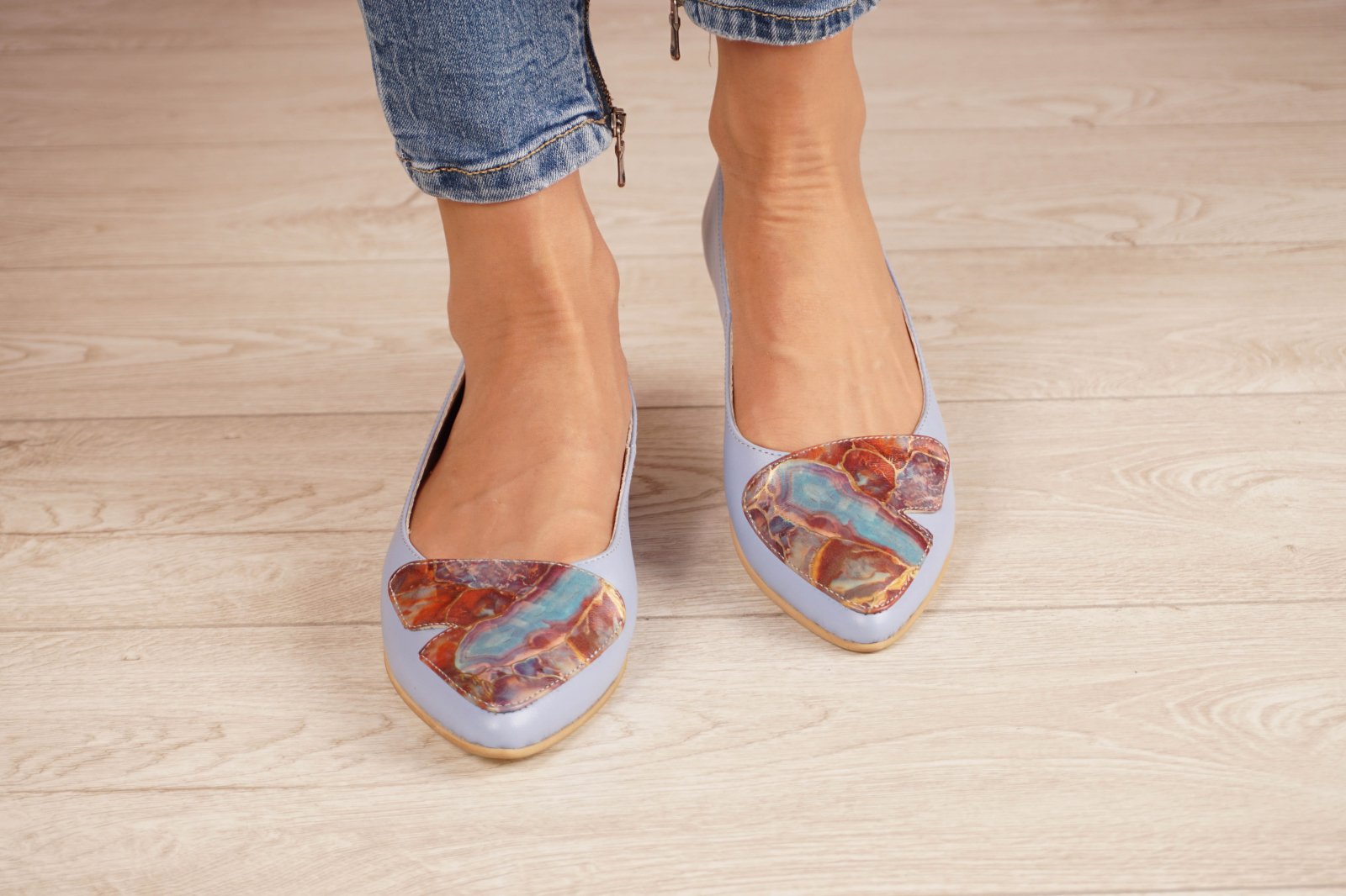 Pantofi dama tip balerini din piele naturala albastru deschis bleu si cu imprimeu
