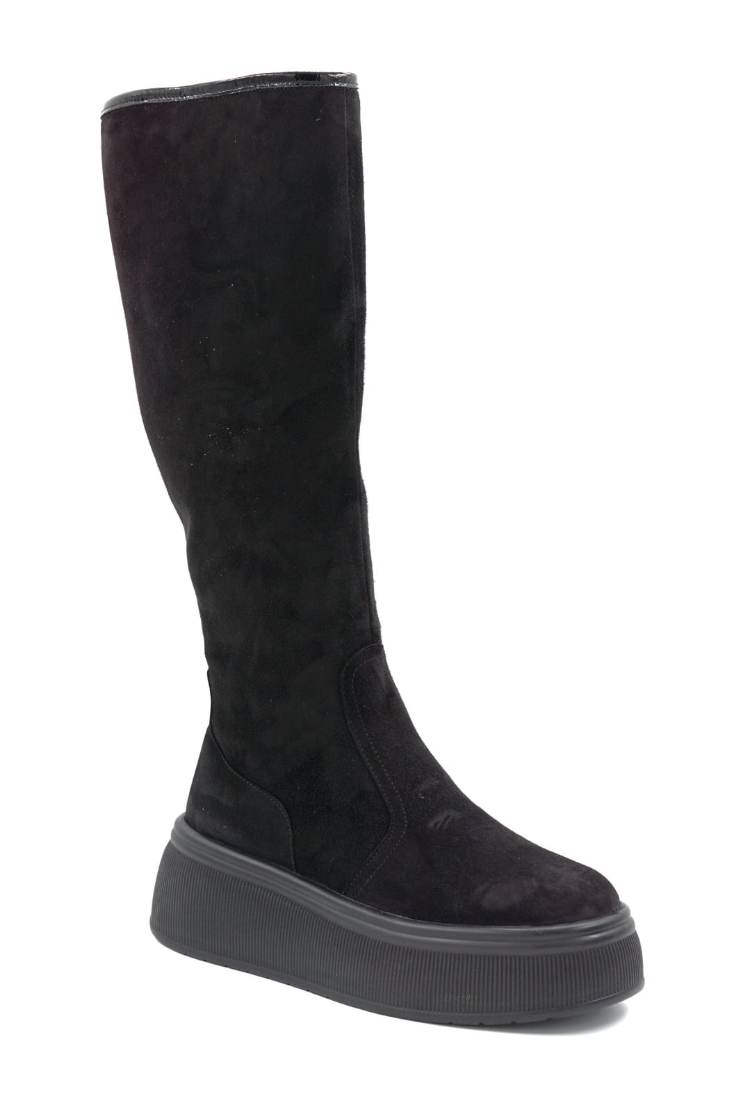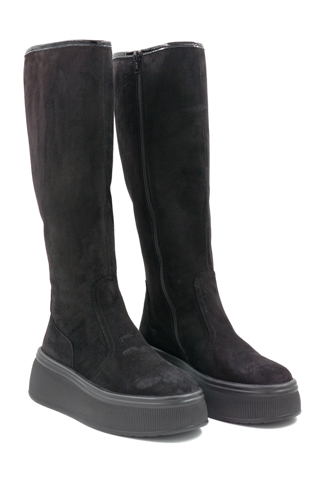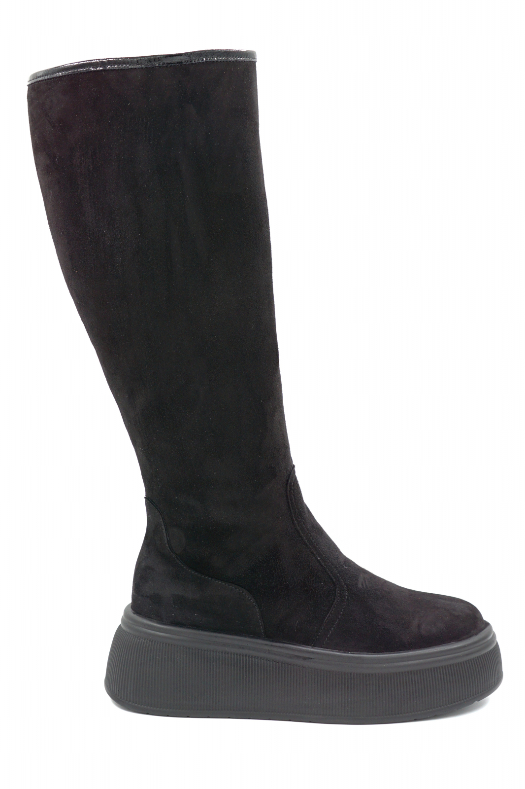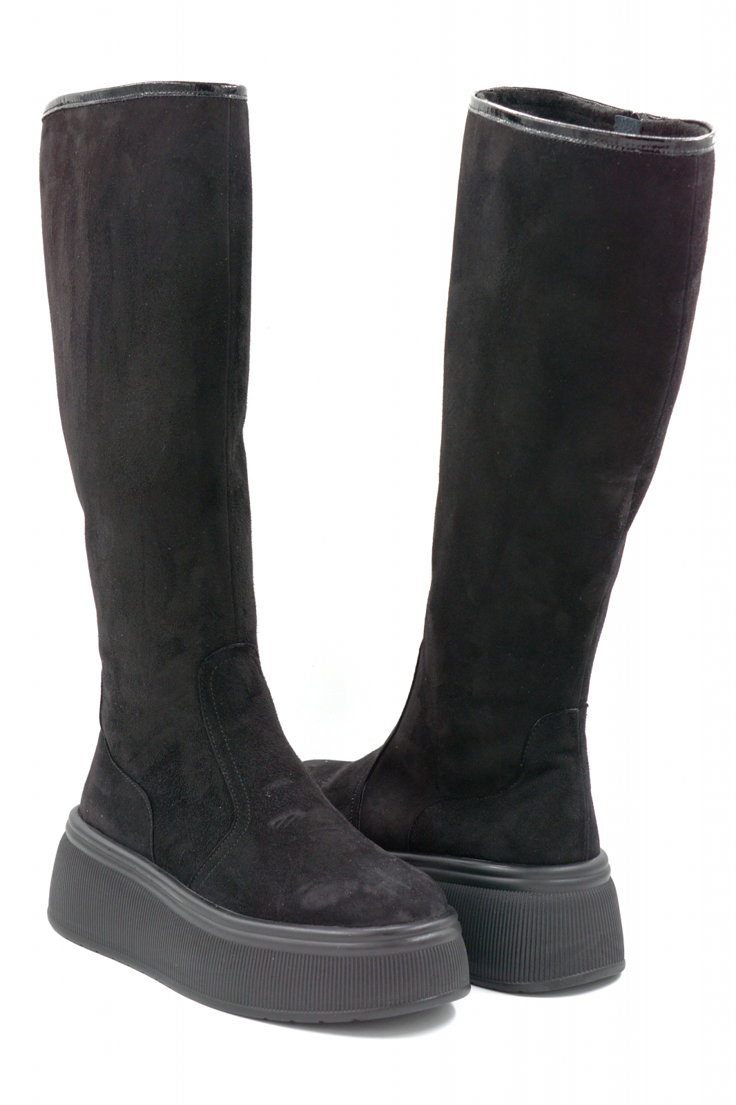 Cizme dama lungi casual din piele naturala intoarsa neagra cu varf rotund si talpa groasa de 5 cm 77121-24