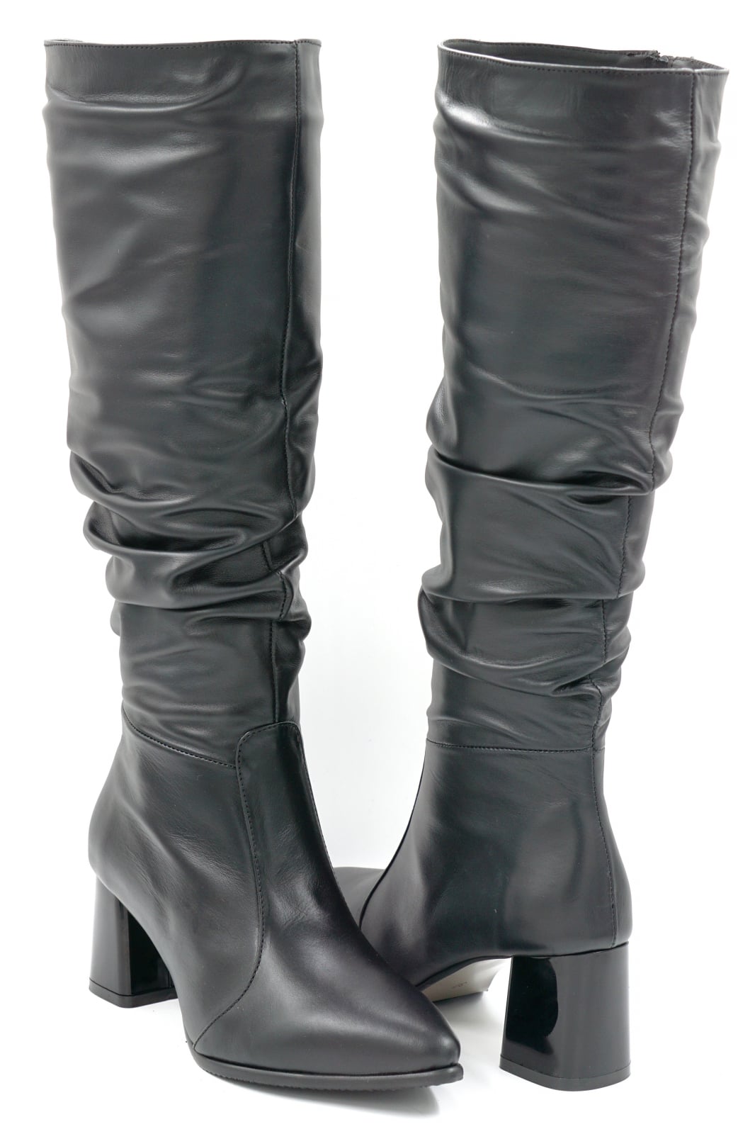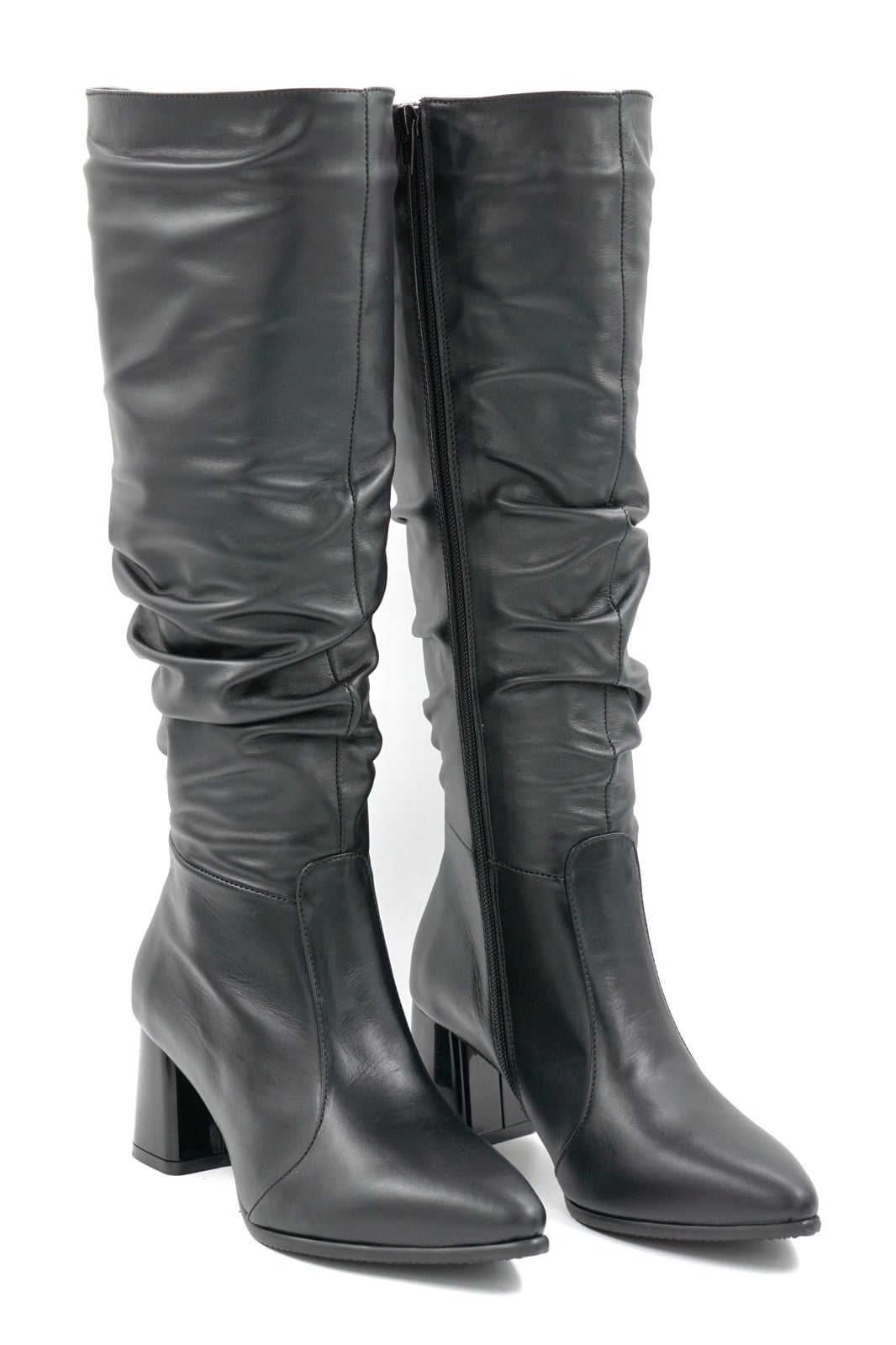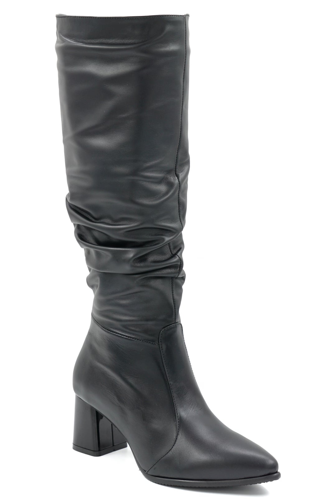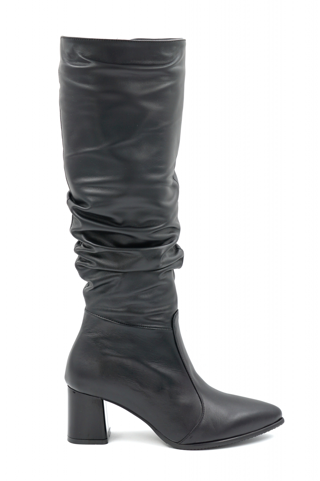 Cizme dama lungi elegante fronsate din piele naturala neagra cu varf ascutit stileto si toc mic gros 6 cm 78321-24