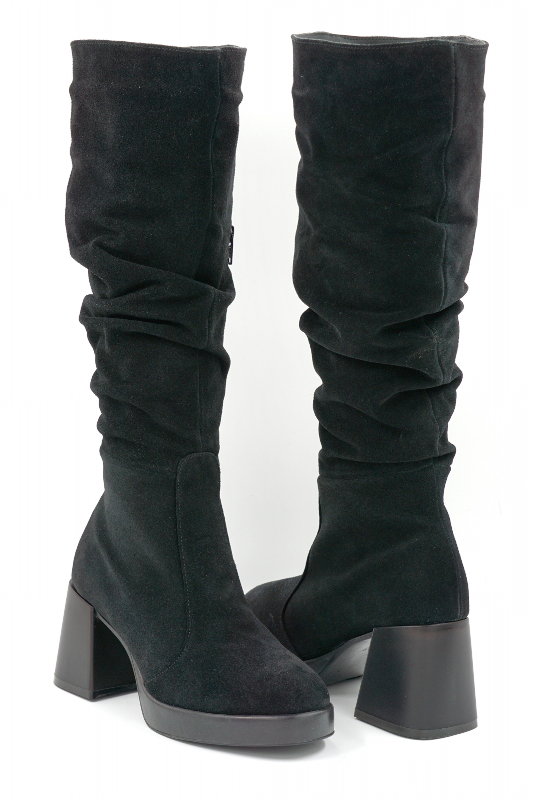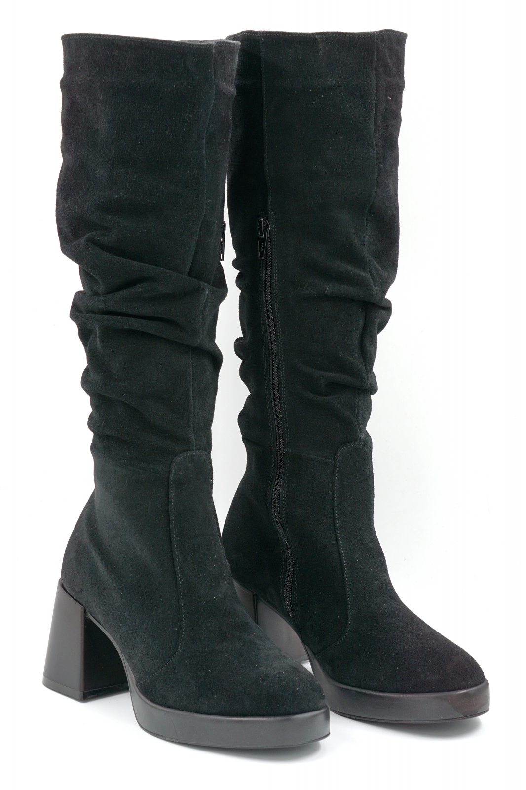 Cizme dama lungi elegante fronsate din piele naturala intoarsa neagra