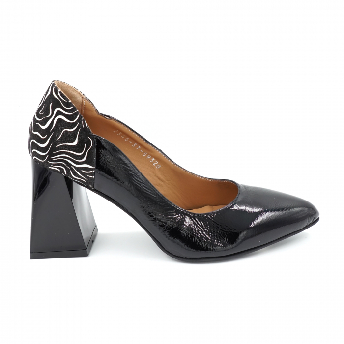 Pantofi dama din piele naturala lacuita neagra si cu imprimeu argintiu