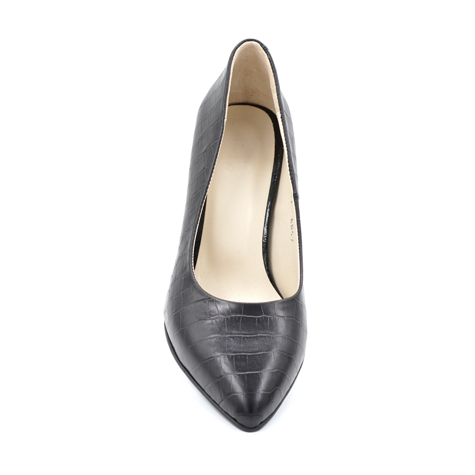 Pantofi dama din piele naturala croco negru mat cu varf ascutit stileto si toc mic gros 6 cm 6057-5-24