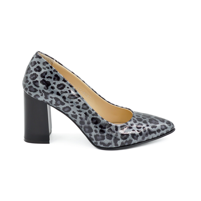Pantofi dama din piele naturala lacuita gri cu imprimeu leopard