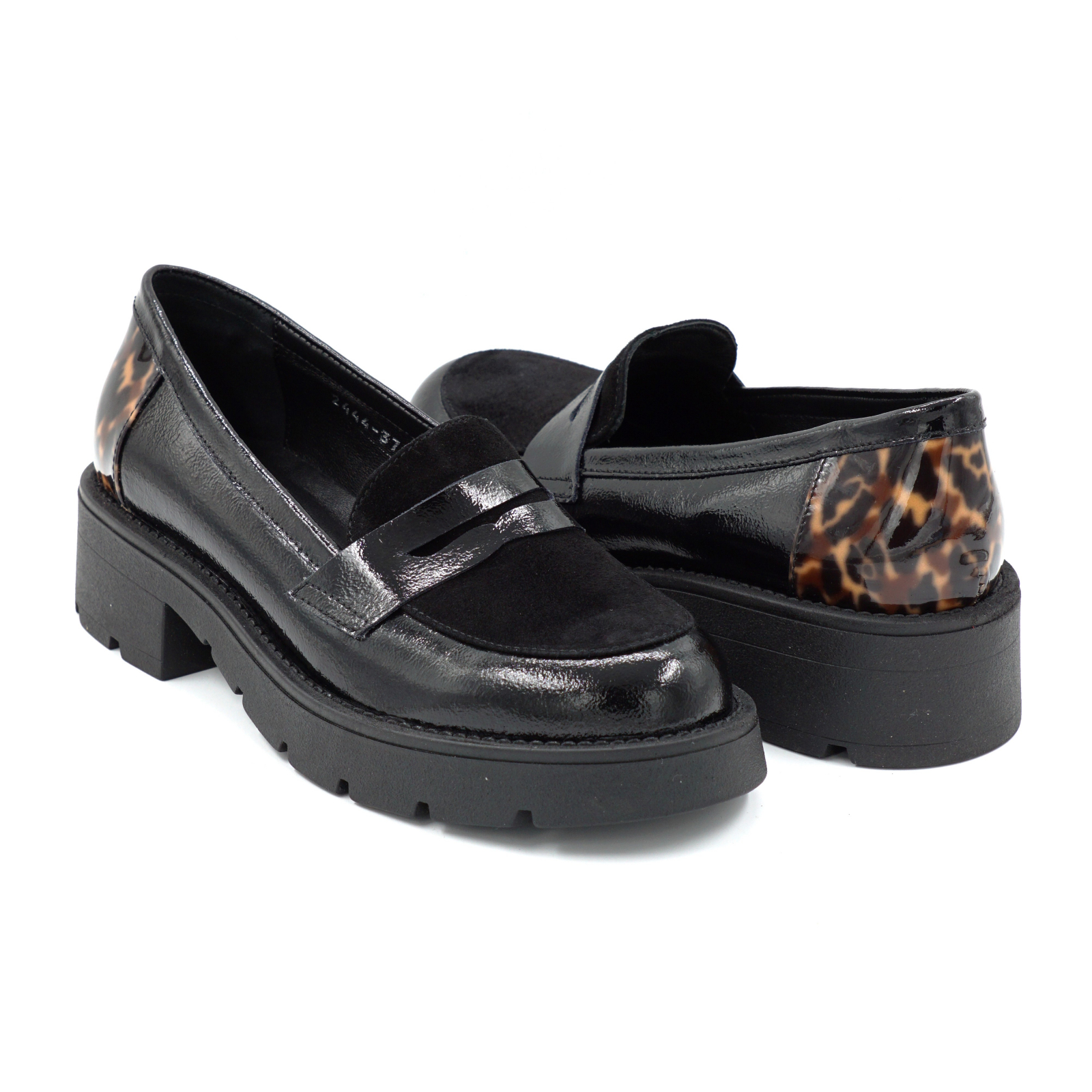 Pantofi dama din piele naturala lacuita si intoarsa neagra si cu imprimeu lacuit animal print