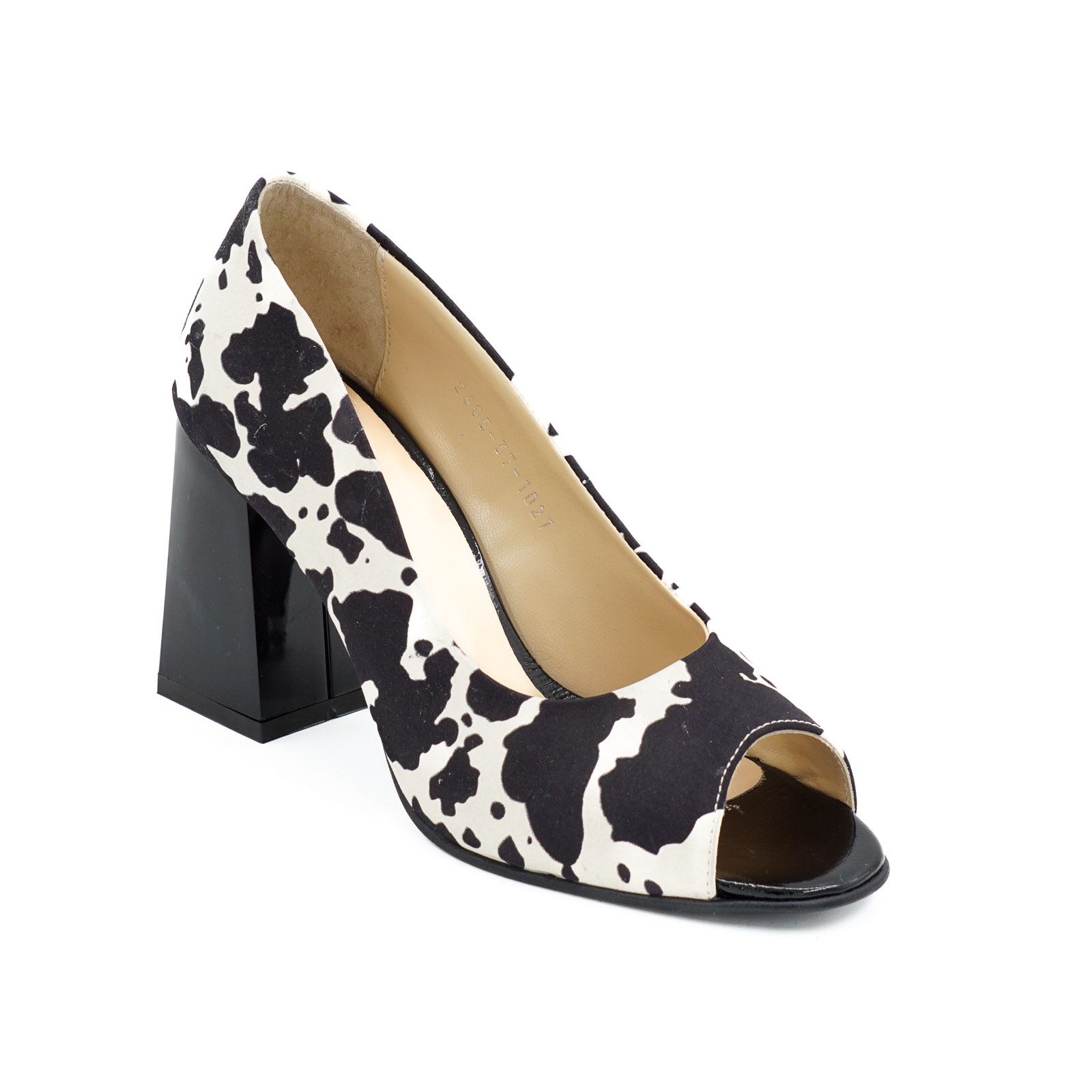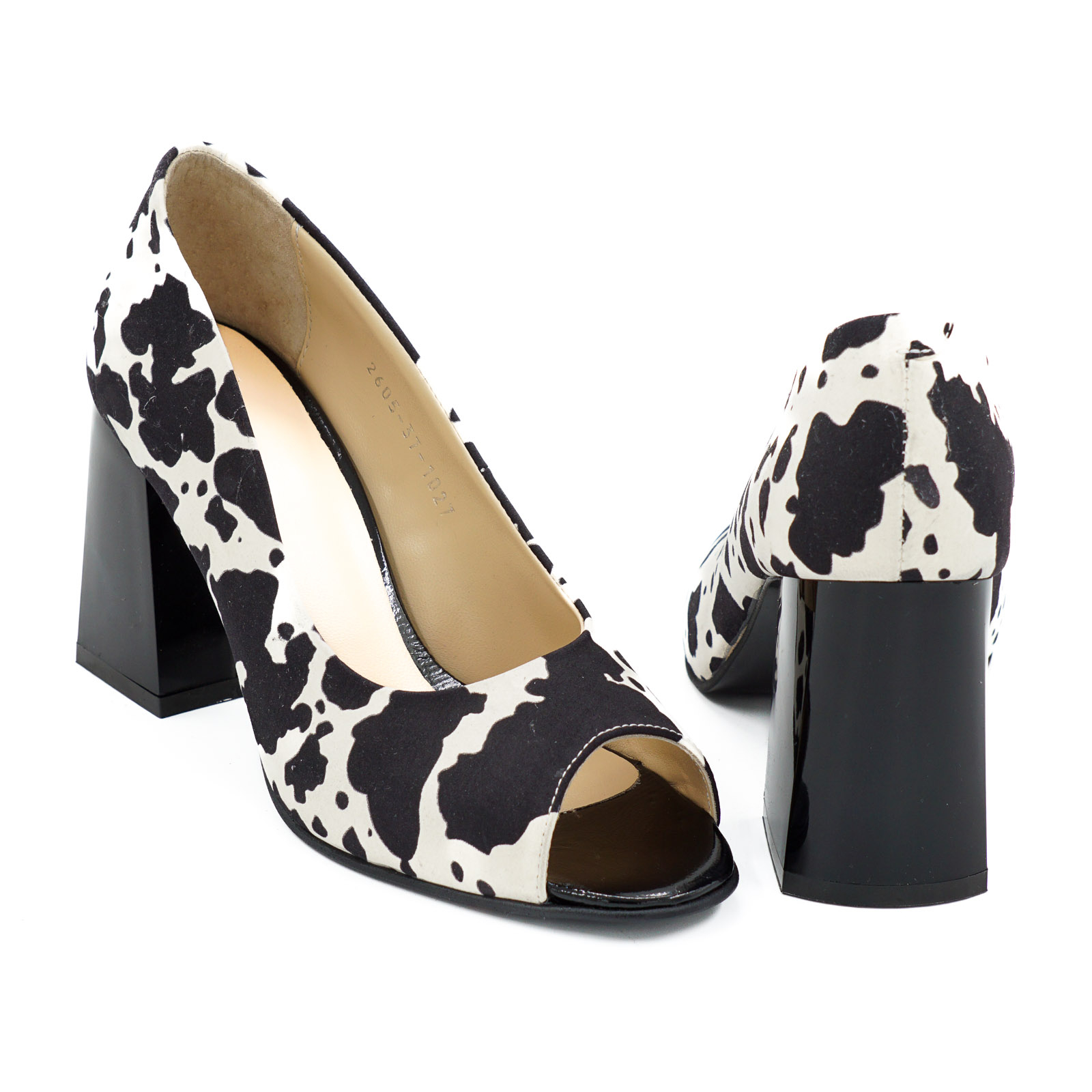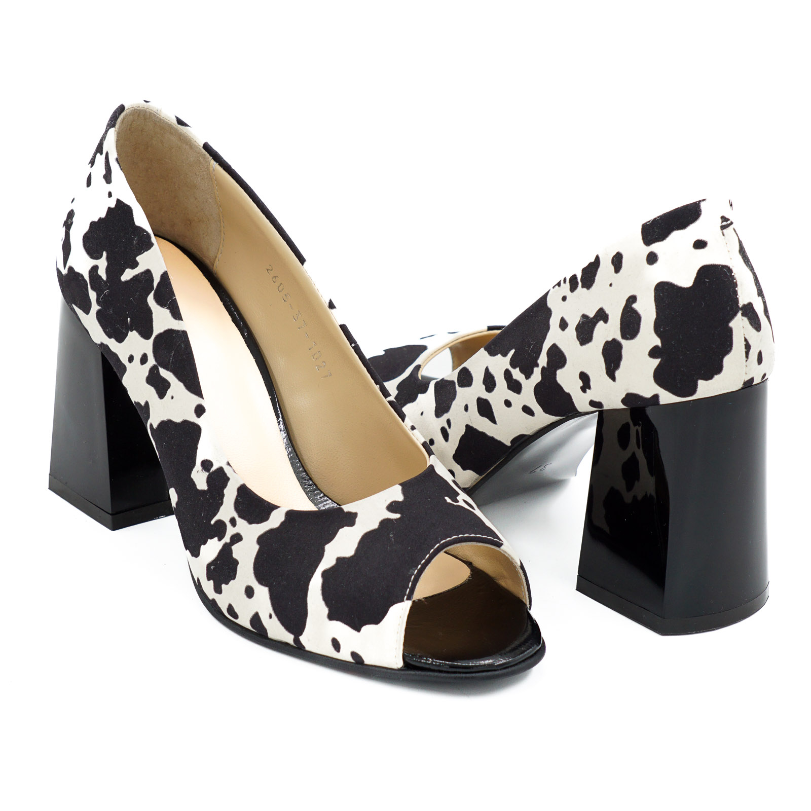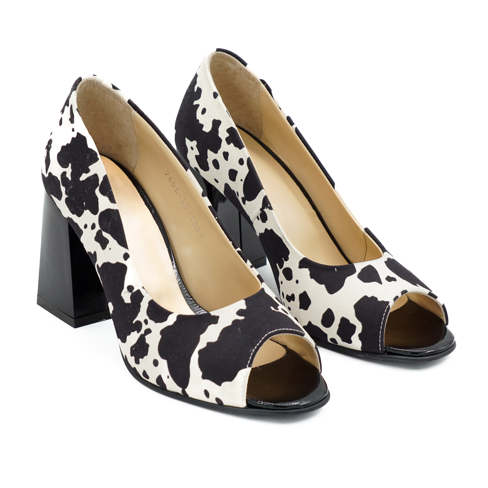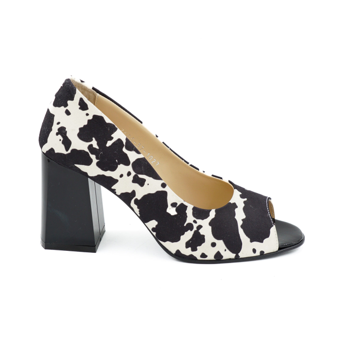 Pantofi decupati dama din piele naturala alba cu imprimeu pete negre