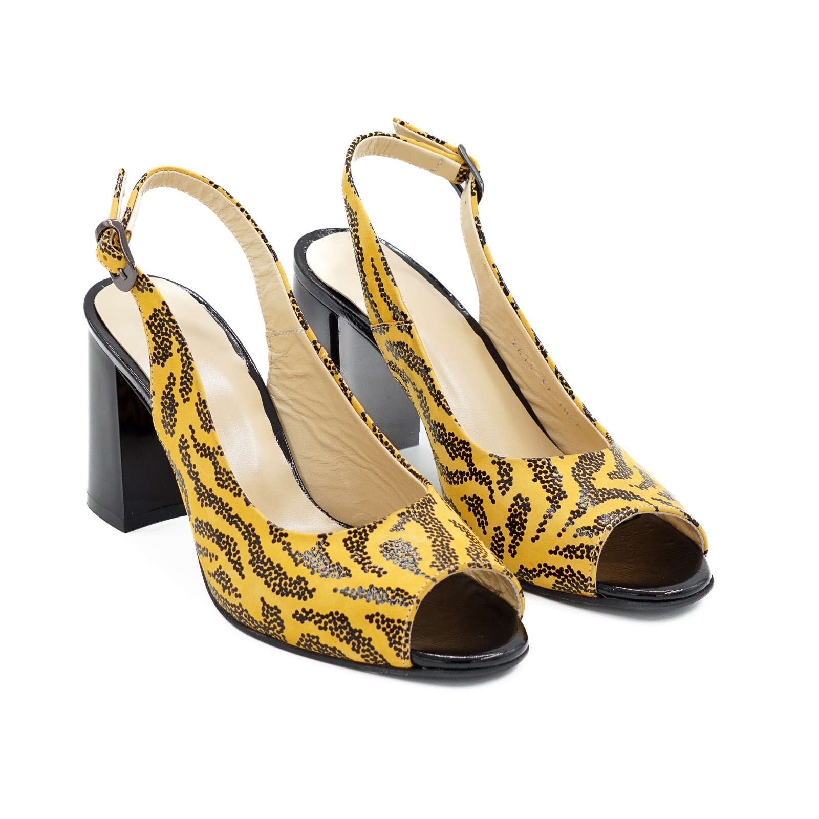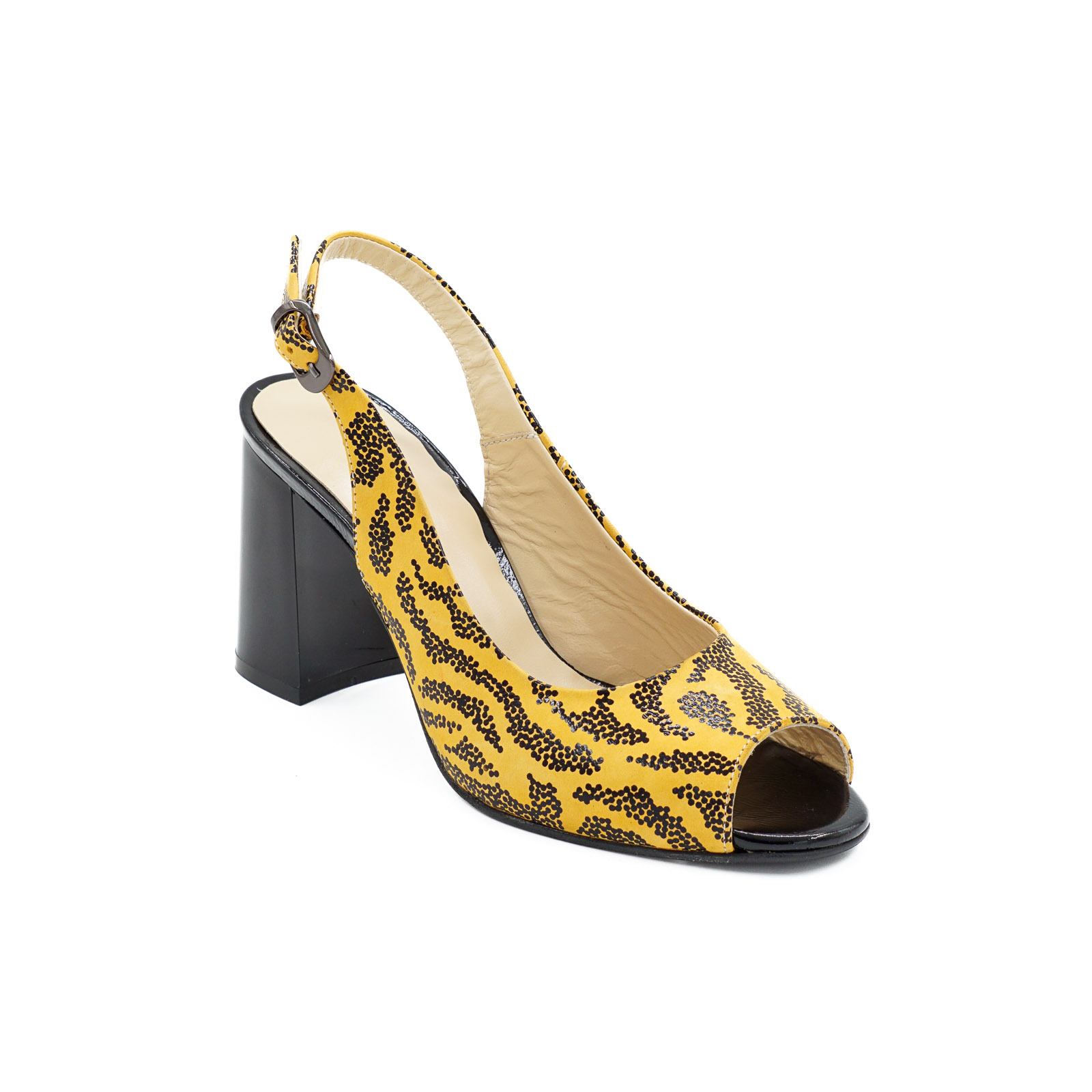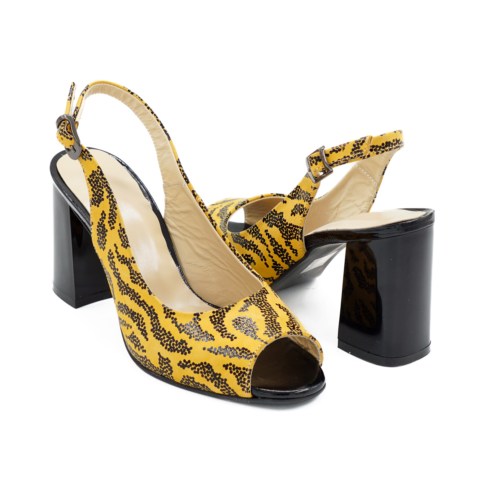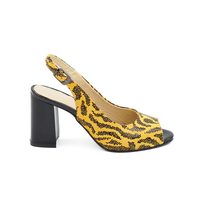 Sandale dama din piele naturala galben mustar cu imprimeu negru