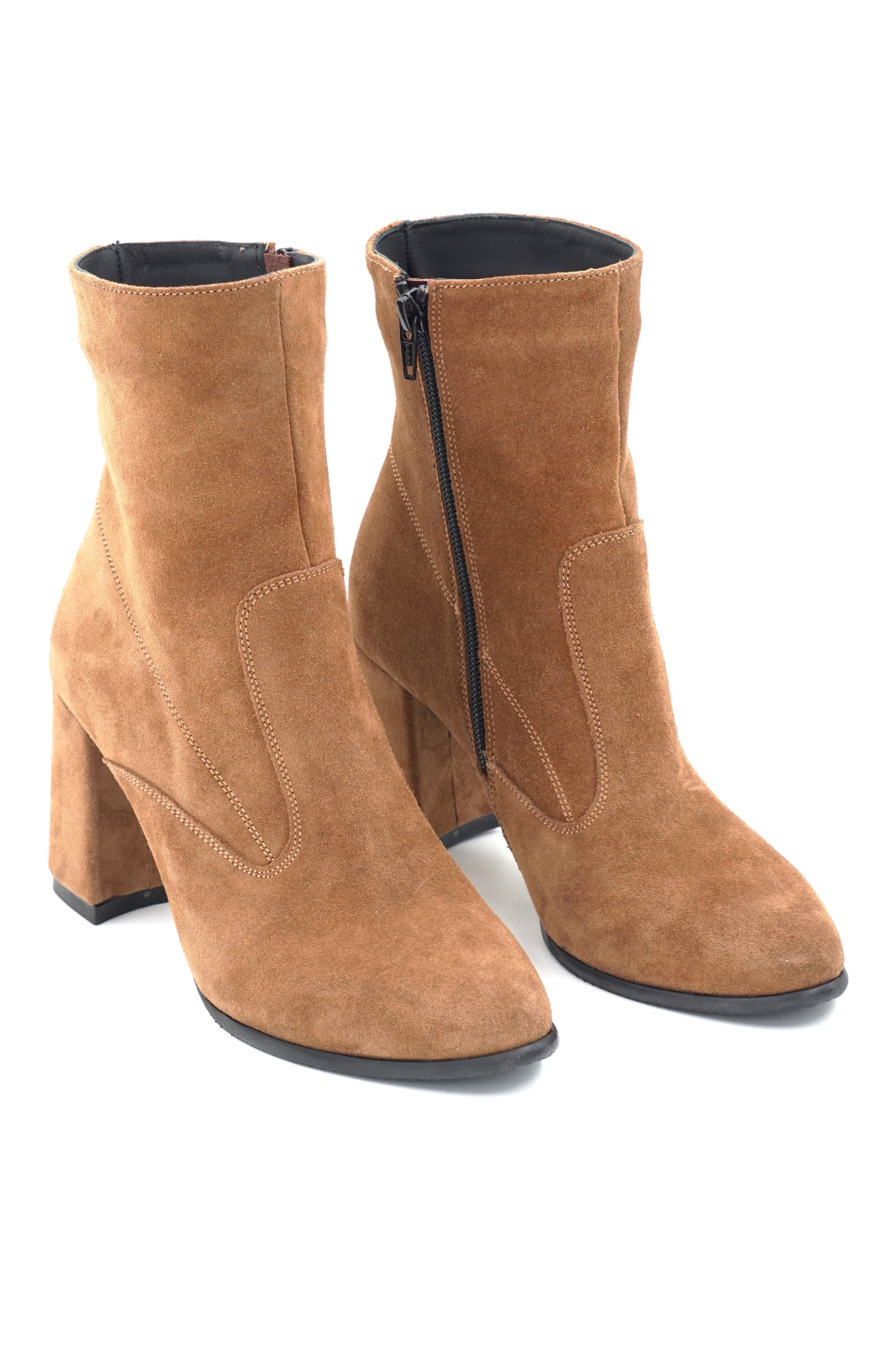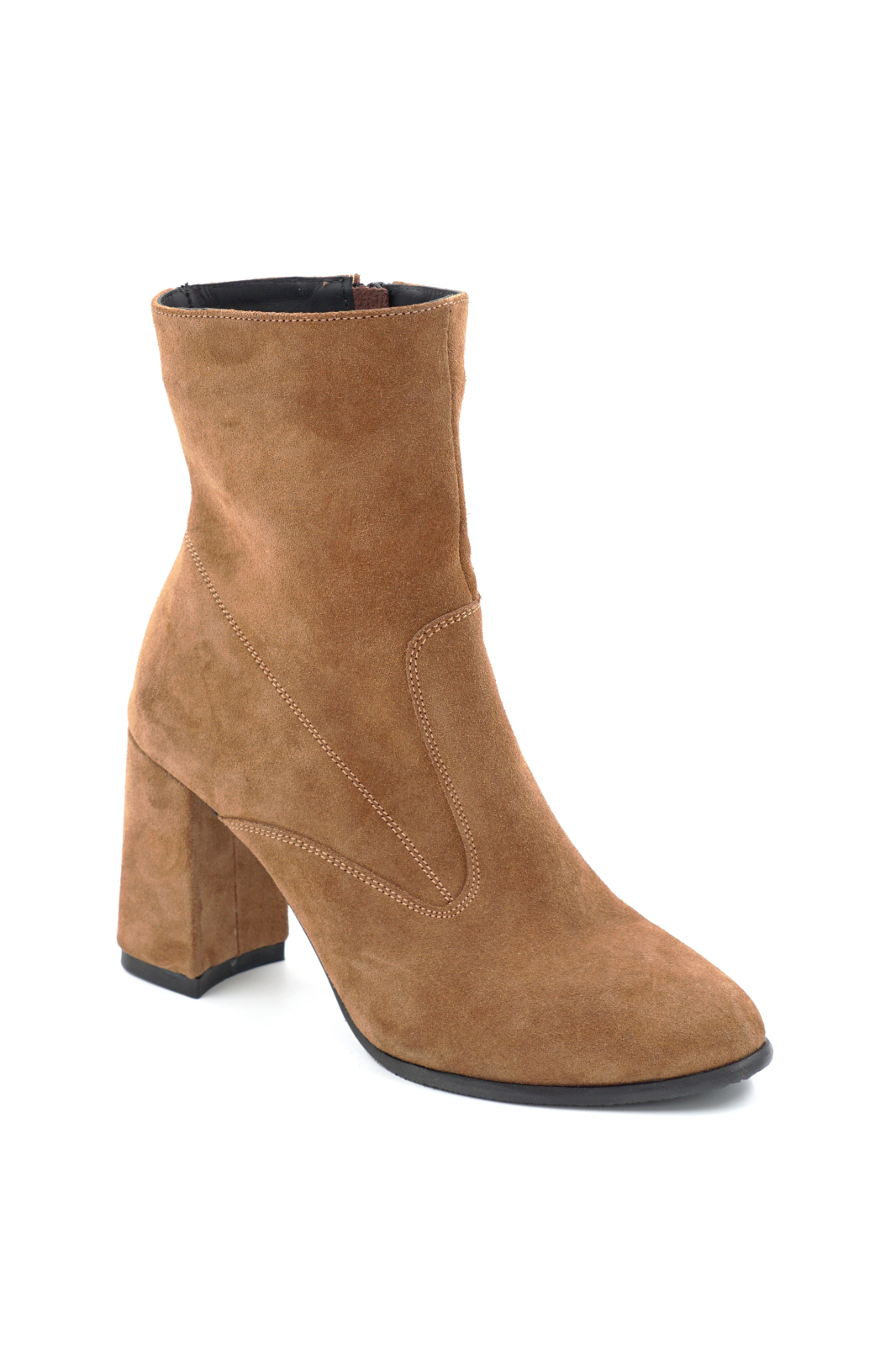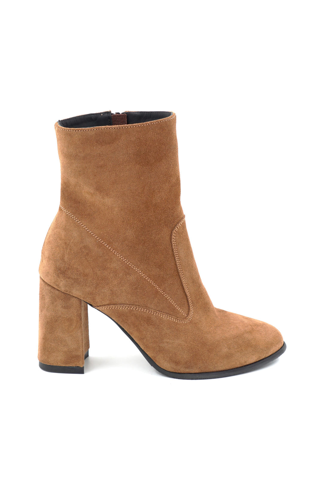 Ghete dama din piele naturala intoarsa maro coniac cu varf ascutit si toc mediu gros imbracat de 7 cm 70424-24