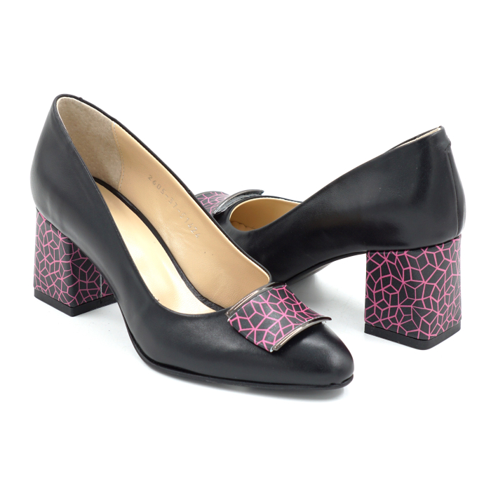 Pantofi dama din piele naturala neagra cu varf ascutit si toc mic gros imbracat de 6 cm 51424-1-26